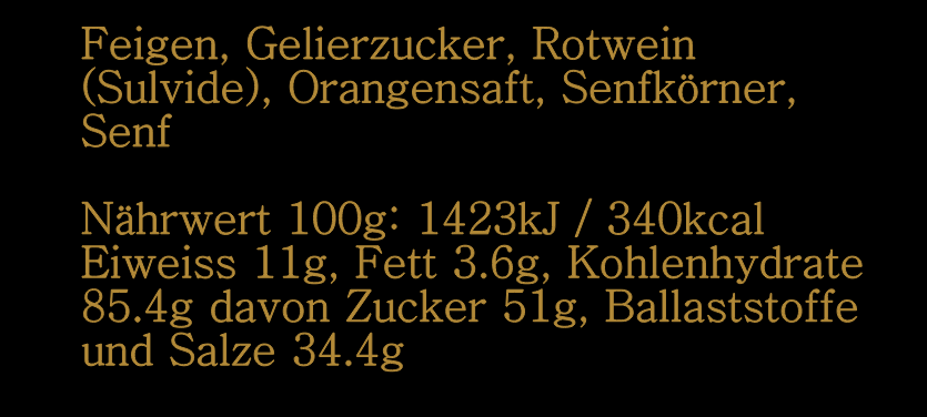 | Zutaten: | Feigen, Gelierzucker, Rotwein (Sulvide), Orangensaft, Senfkörner, Senf |